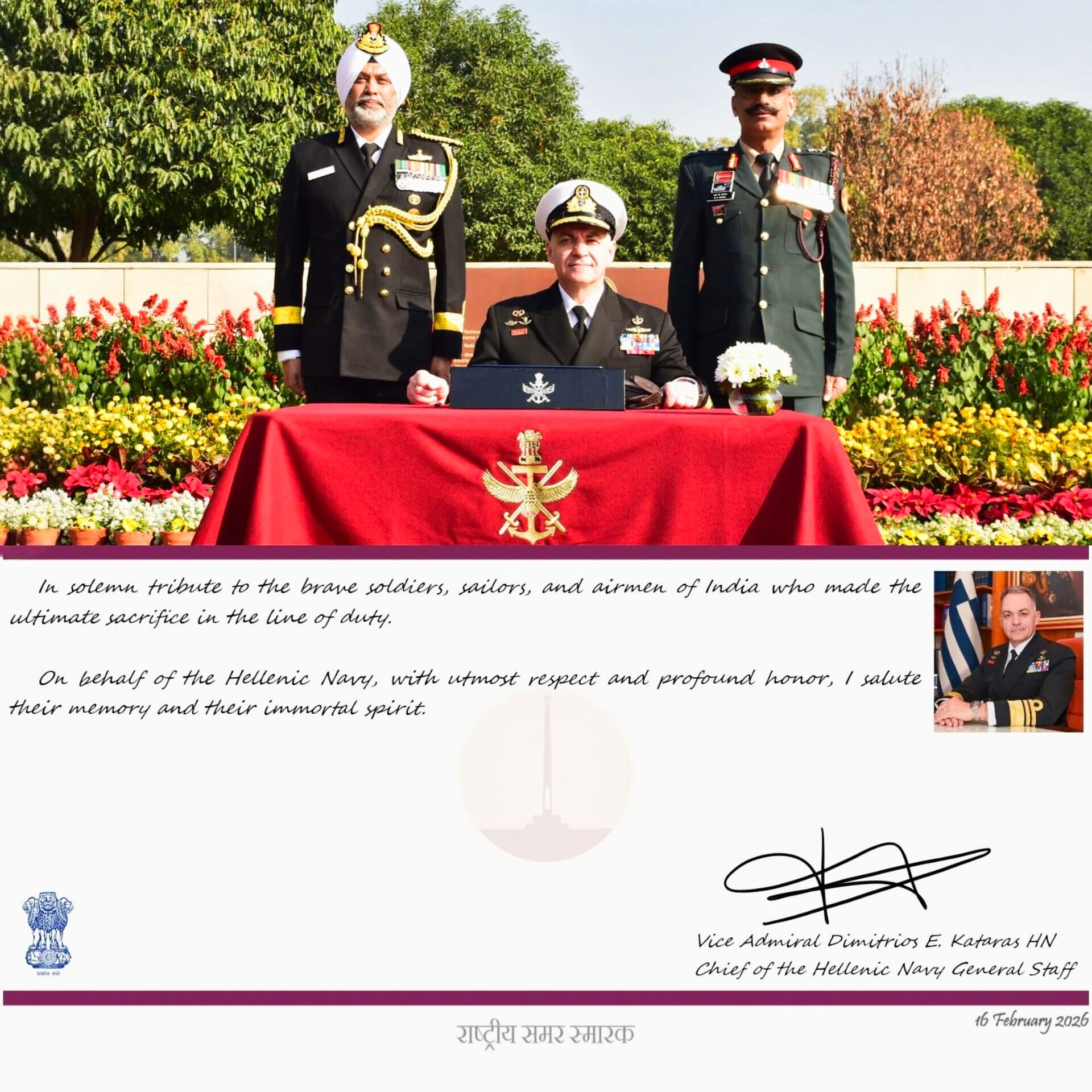 Από τη Δευτέρα 16 έως και την Πέμπτη 19 Φεβρουαρίου 2026, o Αρχηγός ΓΕΝ Αντιναύαρχος Δημήτριος Ελευθέριος Κατάρας ΠΝ, πραγματοποίησε επίσημη επίσκεψη στην Ινδία, κατόπιν πρόσκλησης του ομολόγου του Admiral Dinesh K Tripathi.