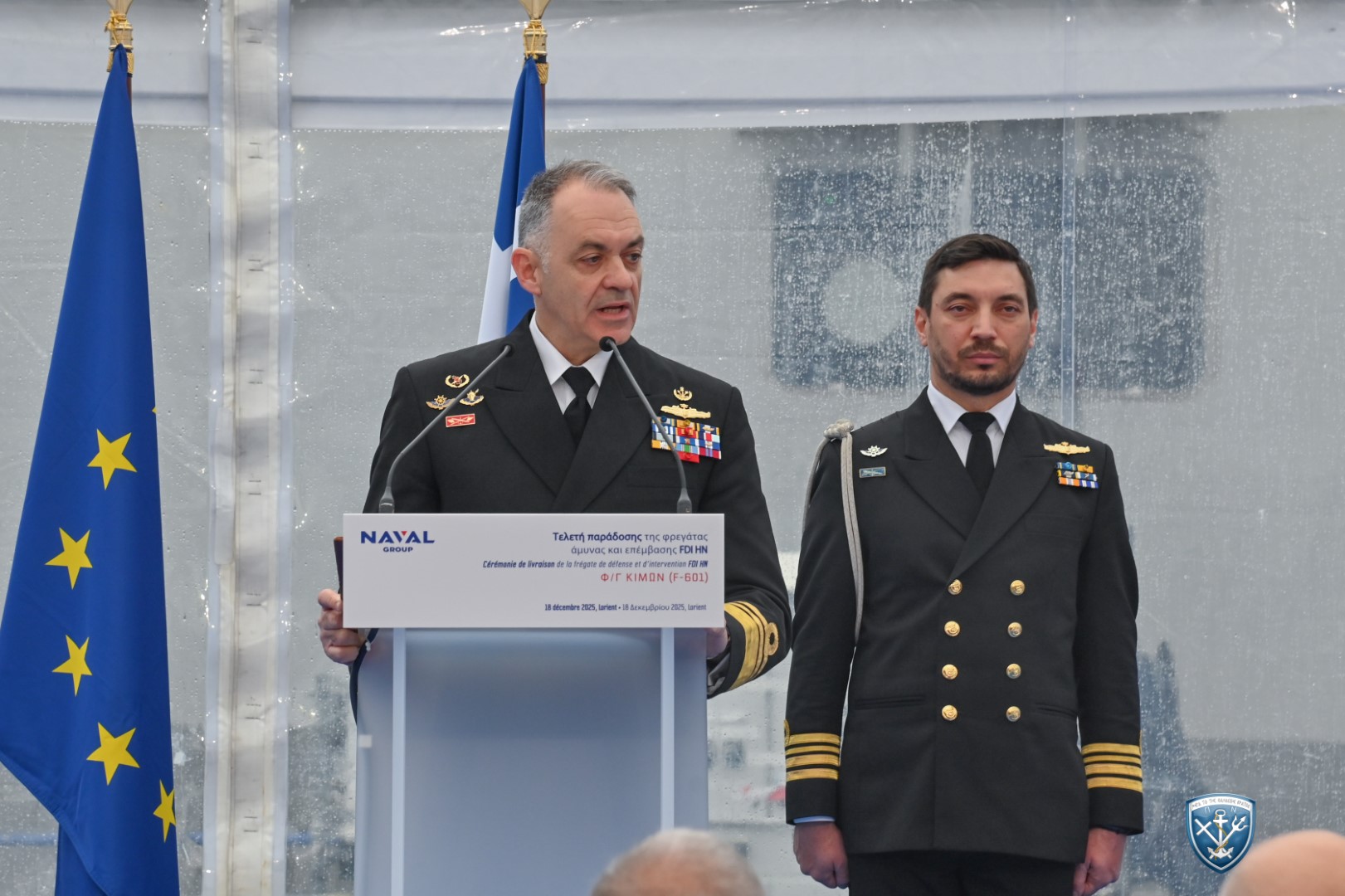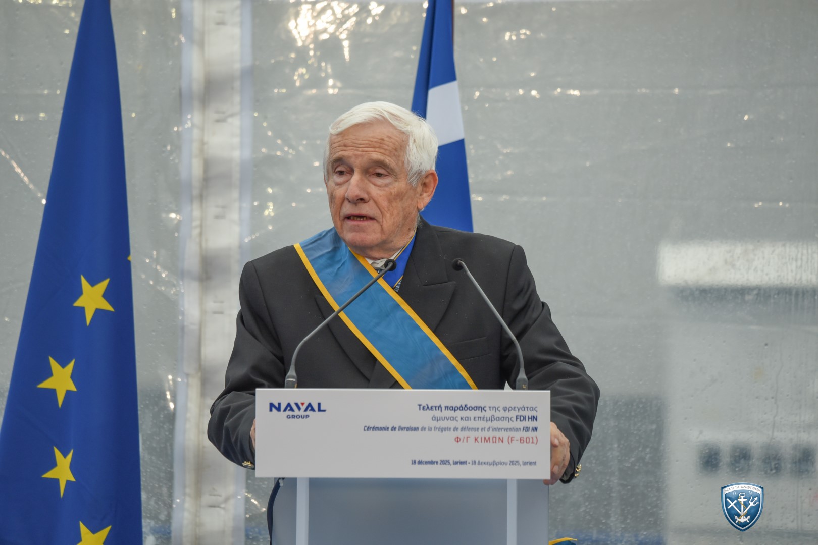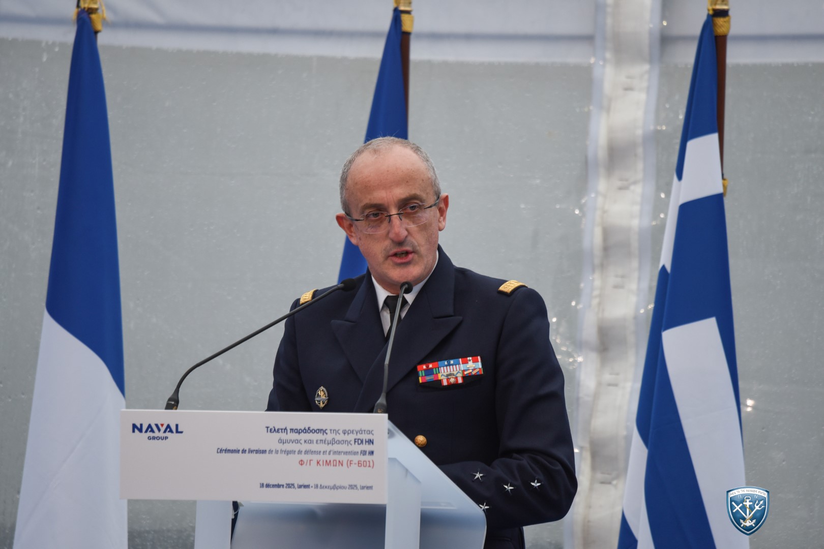 “ Με ιδιαίτερη χαρά, μεγάλη περηφάνια και μοναδική τιμή, ευρίσκομαι σήμερα στη Lorient, στα εντυπωσιακά Ναυπηγεία της Naval Group, για την ιστορική τελετή ύψωσης σημαίας και ονοματοδοσίας της 1 ης Φρεγάτας FDI του Πολεμικού Ναυτικού, της Φρεγάτας ΚΙΜΩΝ.